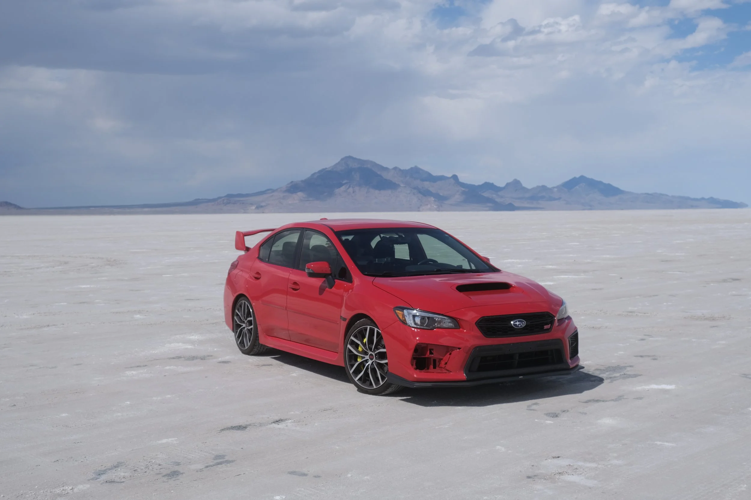 The STi against the stark backdrop of the hallowed grounds of the Salt Flats